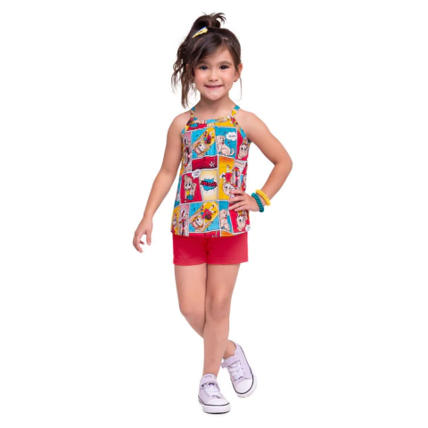 Conjunto Kyly Menina, Blusa regata de alças finas, estampa divertida história em quadrinhos e Short com elástico na cintura, 100% algodão.